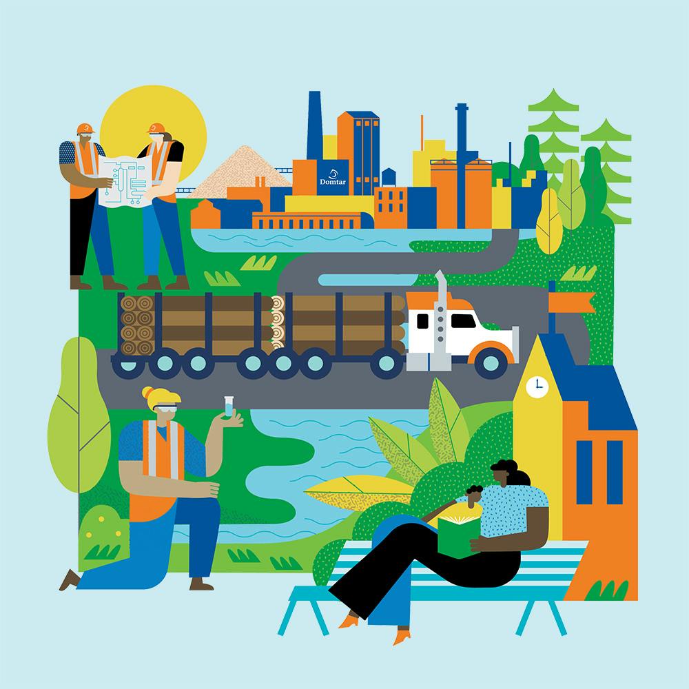 To celebrate 175 years of innovation, Domtar’s employee culture guide used illustration as a storytelling device — transforming each page into a “portal” through time. The art symbolizes progress, sustainability, and human connection, visually linking the company’s past to what’s next.